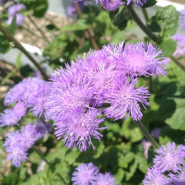 通常のアゲラタムは、真夏は一度花が休みがちですが、バモスシリーズは真夏でも咲き続けることが多いです。株がこんもりまとまるので、花壇や寄せ植えの花として楽しんでください。